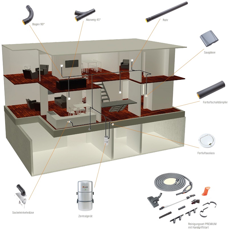 Das Zentralgerät, platzierbar in Keller oder Hauswirtschaftsraum, ist durch Unterputzrohre mit den einzelnen Vakuumsteckdosen in Ihrem Gebäude verbunden.