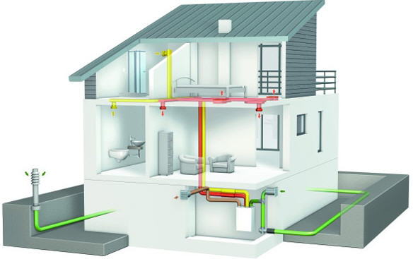 Diese Wärmeenergie wird der Luft, die die Belüftung der Räume gewährleistet (Zuluft) wieder zugeführt.